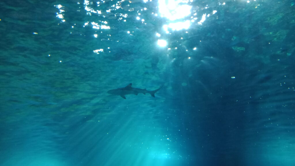 水族館にありがちな仕掛けですが、トンネルになっていて水槽の下を歩けます。先程のエリアの下に位置しているので、エイやサメなどを下や横から見ることができます。