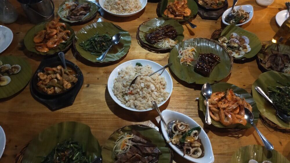 フィリピン料理は煮たり焼いたり揚げたりがほとんどで、野菜が少ないのが特徴です。適当に何品か頼むとこんな感じになります。