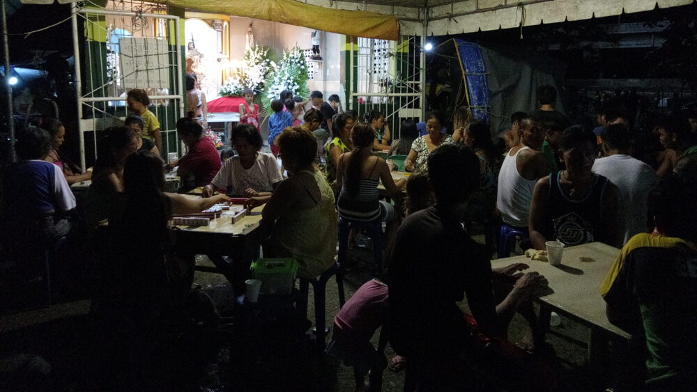 フィリピンでは火葬はしないので、教会には遺体が安置されています。やっているのはトランプや麻雀です。