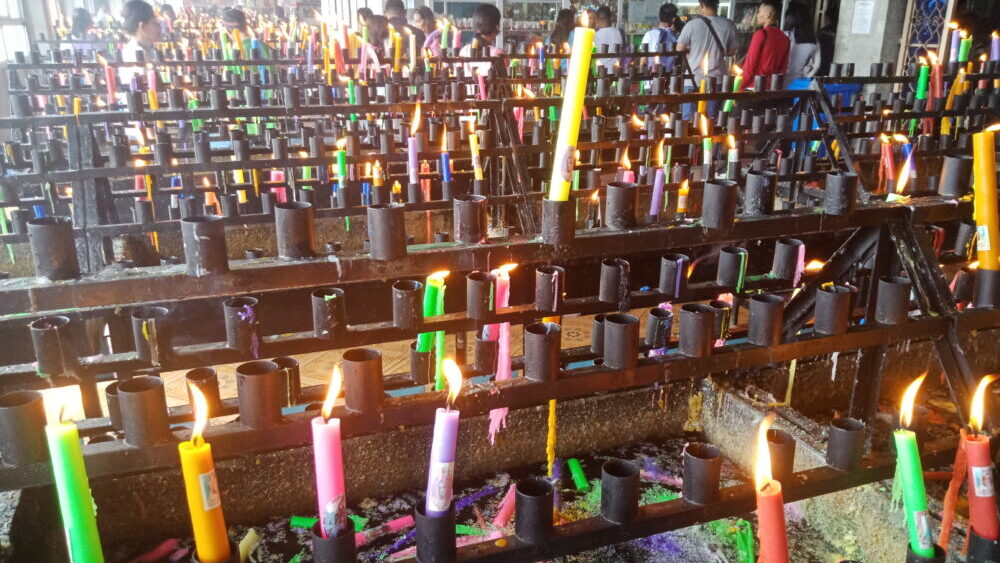 シマラ教会では、ロウソクに願いを込めて祈ります。日本の占いや風水で色ごとに意味があるように、ロウソクにもそれぞれ意味があります。Cebu Simala Shrine – Lindogon: The Miraculous Castle Church